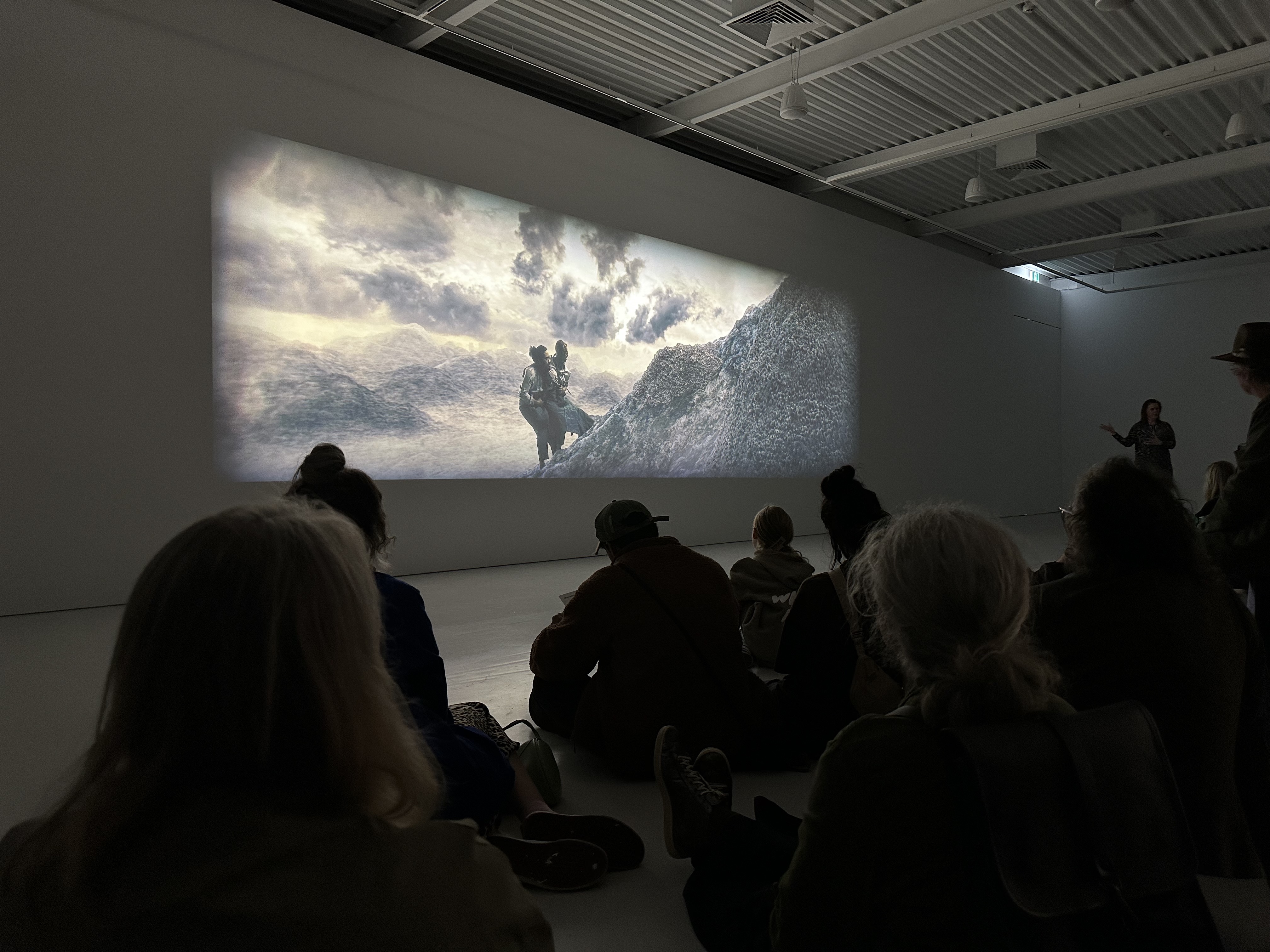 Tozer's lessons from the ground are most effectively expressed when they find form in the film's construction. Exploring the constant cycle of geological activity, Tozer challenges temporal linearity, favouring a cyclical, non-Western concept of time as a way to interpret current ecological pressures. This is embodied in the continuous looping of the film, which lacks a clear start or definitive end point. The film and the figures are in a constant cycle of renewal and, owing to this interminable quality, I struggled to find the right moment to withdraw.